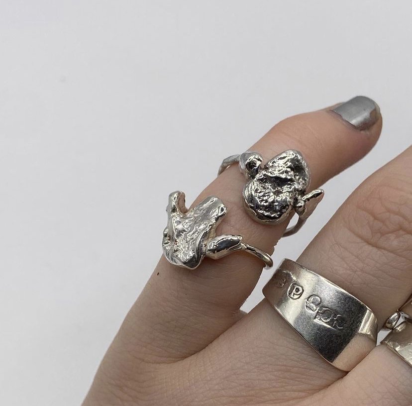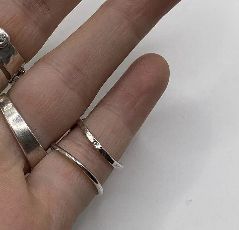 Each looks a little different, each is totally unique. A small lump of melted silver is secured to a narrow, hammered band. Heavily textured, extensively polished.